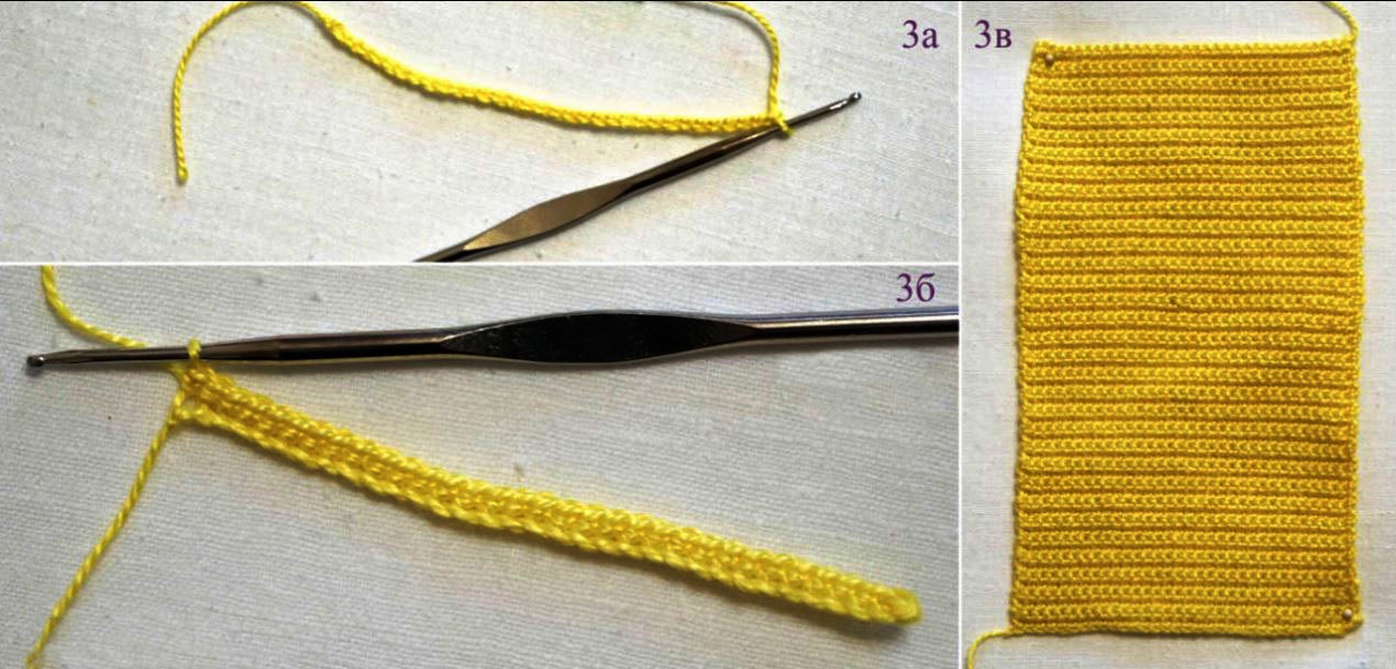 1р.: 1 ССН в 5-ую ВП цепочки от крючка, 14 ССН в след. 14 ВП основания цепочки,5 ССН в следующ. ВП основания цепочки, 15 ССН в следующ. 15 ВП основания цепочки с обратной стороны, 4 ССН в следующ. ВП основания цепочки от крючка. Завершаем рядок соединительным столбиком.