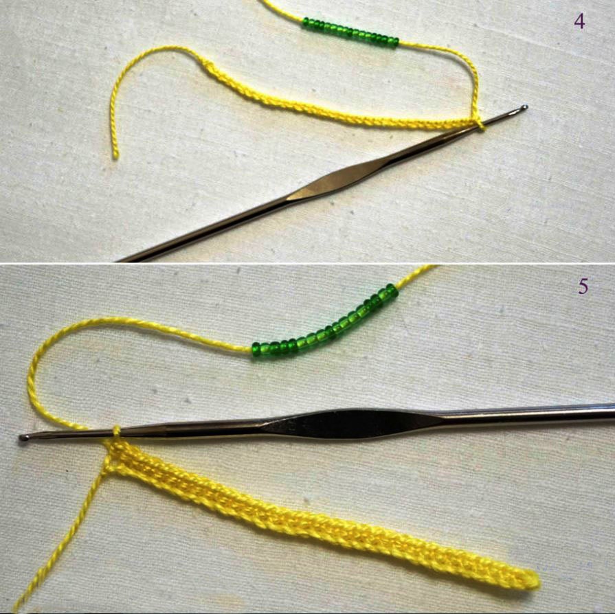 Делаем 33 ВП = 32 ВП + 1 ВП подъема (ф. 4). Поворачиваем вязание и вяжем 1р. СБН без бисера (ф. 5).