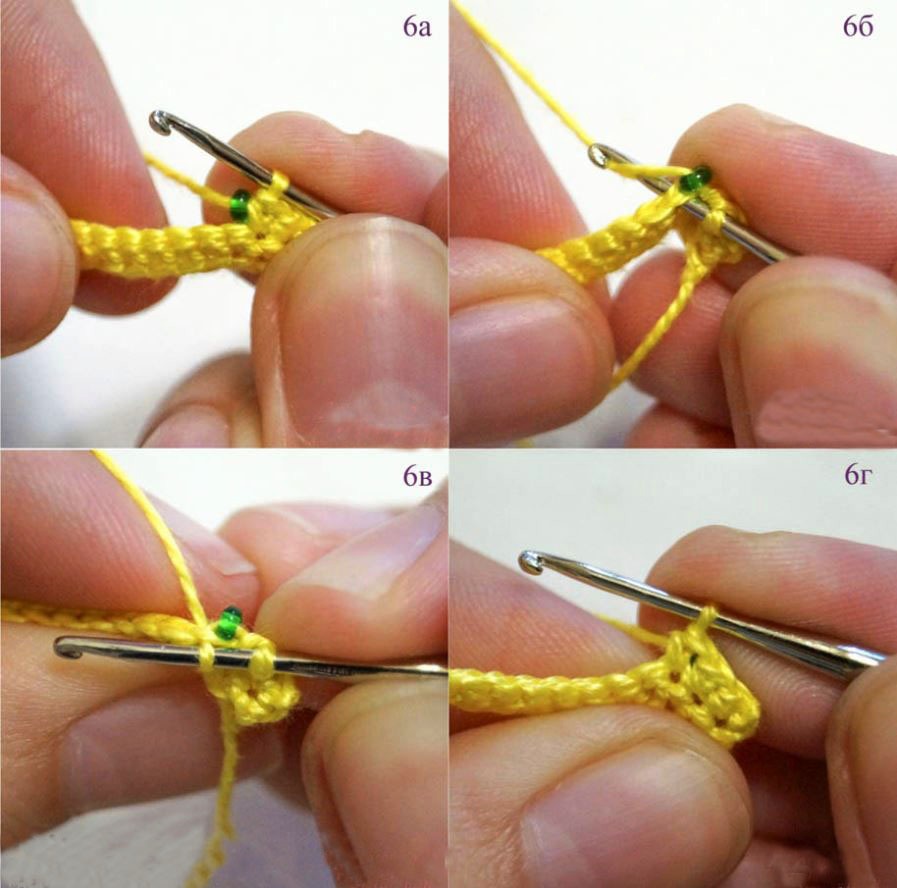 Перемещаем бусинку вплотную к петлям (ф.6а). Заводим крючок в ближайший стлб предыд. р., при этом бусинка должна остаться за работой (ф.6б). Захватив нитку за бусинкой, вытягиваем новую петельку (ф.6в).