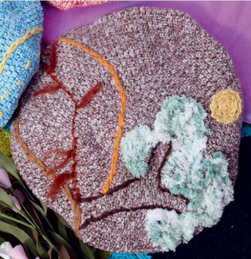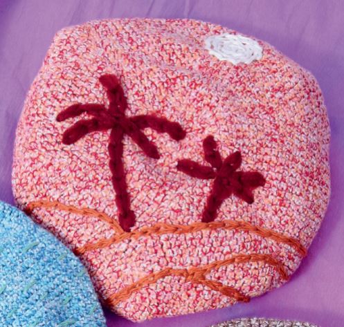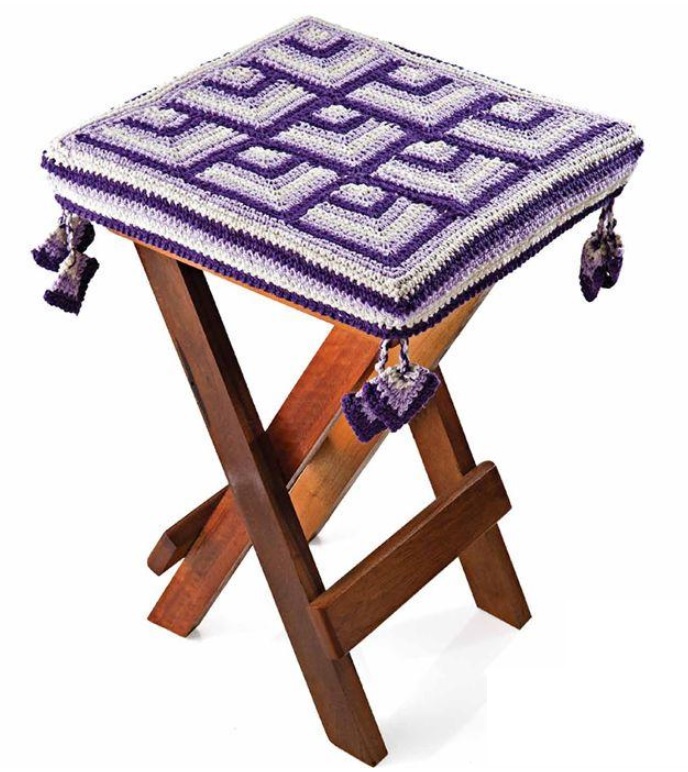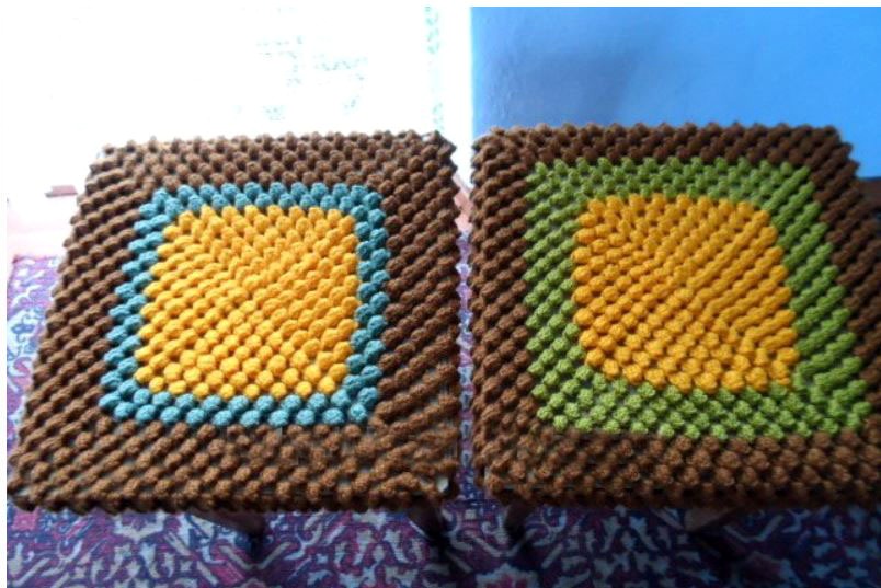 Закончив выполнение сидушки до нужного размера, вывязываем два рядка шишек без прибавок на углах, в последнем ряду шишки вывязывать через 2 в/п. Получаем сужение чехла, которое позволит зафиксировать его на табурете после натягивания.