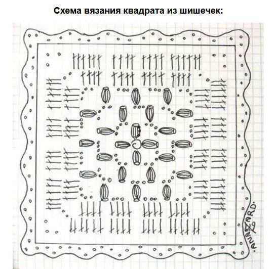 В 3-ем р. из угловых арок вяжем по 2 шишки, между которыми по 4 в/п. На сторонах квадрата 3 в/п, шишки из арки, 3 в/п. Завершаем рядок ССТ в вершину 1-ой шишки.