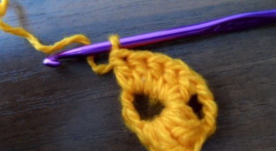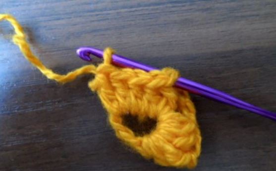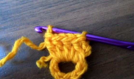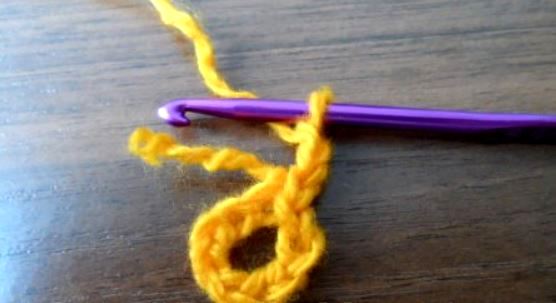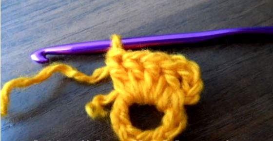 - 1р.: 1 в/п подъема, 5 СБН в получившееся кольцо. Ряд закончить с помощью соед. ст.;
