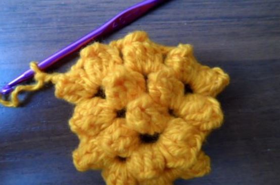 Для 2-го р. делаем 3 в/п подъема. В этом рядке из каждой арки вывязываем по 2 шишки, между которыми по 4 в/п, по сторонам квадрата свяжем по 3 в/п. 1-ая шишка состоит из петелек подъема и 4 СтСН, все остальные шишки – из 5 СтСН.