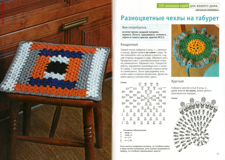 Нам нужно связать девять мотивов по сх. и соединить их в общее квадратное полотно. Готовое изделие, как и все чехлы на табурет желательно обвязать вкруговую. Выполняем крючком 16-ть рядков СБН, чередуя цвета: