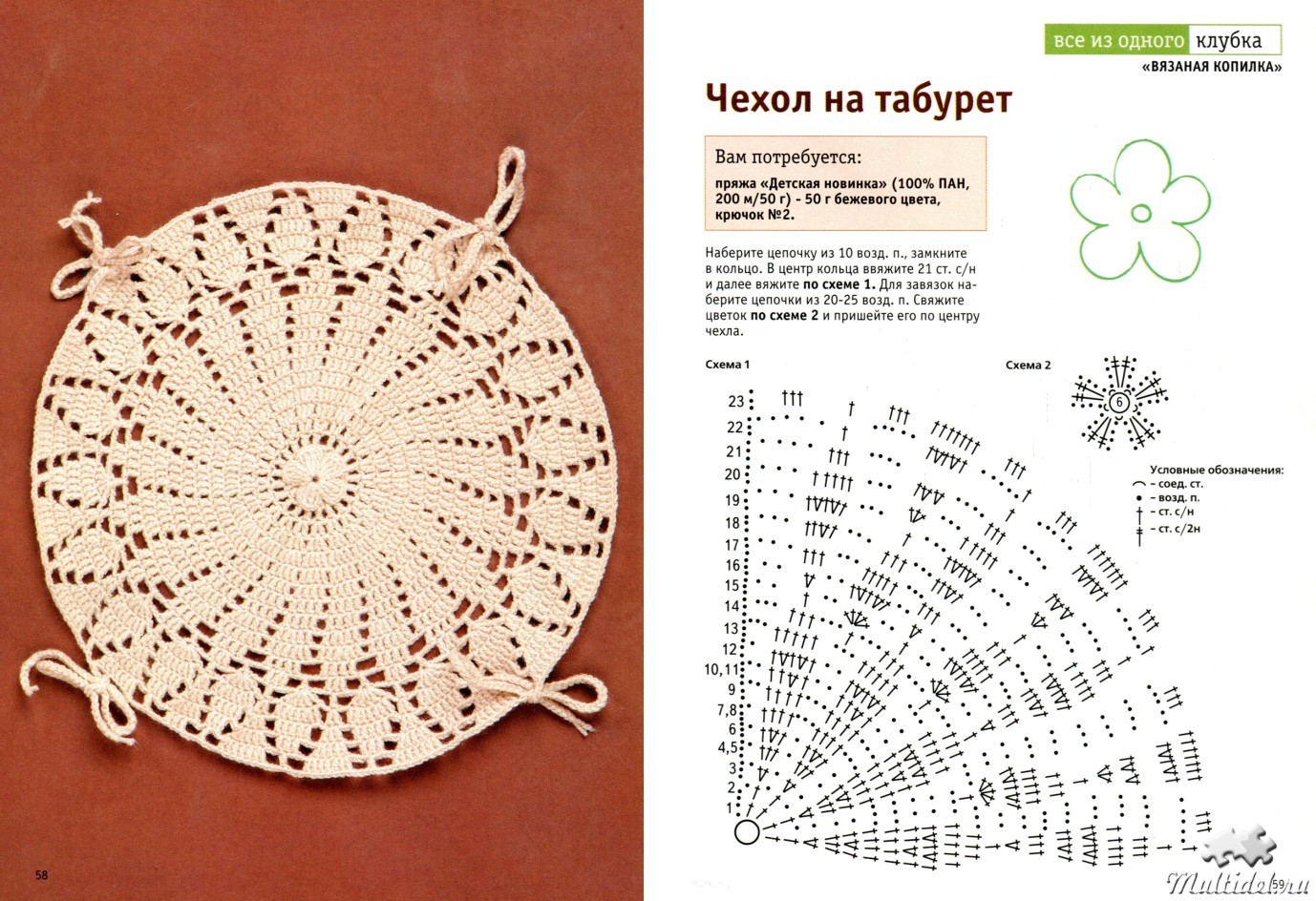 Начинаем вязать чехол на табурет с набора крючком цепочки из 5 ВП. Замыкаем ее в кольцо соединительным столбиком. Далее вяжем чехол по указаниям схемы: