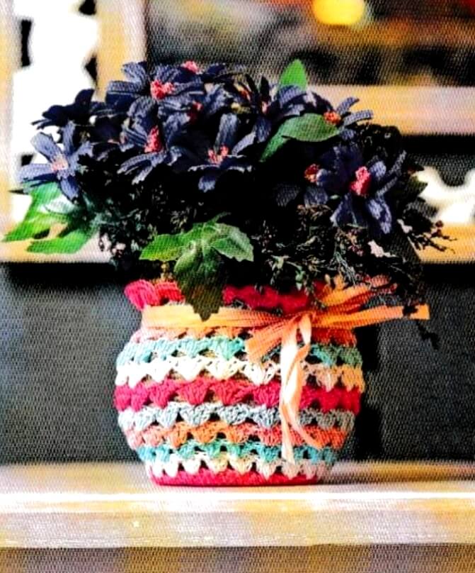 Классические «бабушкины» поделки создают в интерьере очень популярный сегодня стиль шебби-шик. Предлагаем вам связать замечательное кашпо из остатков ниток.