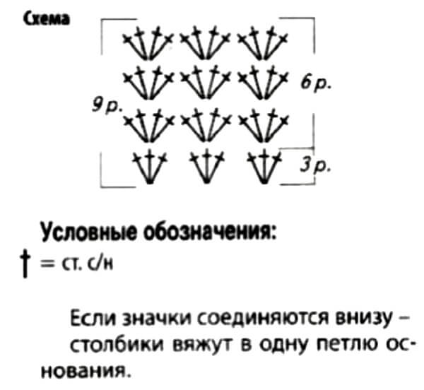 Свяжите коралловой нитью круг СБН диаметром 6 см. Далее вяжите 9 рядков по схеме, меняя цвет пряжи в каждом ряду. Последний рядок провяжите веерочками из 5 ССН. Нить обрежьте.
