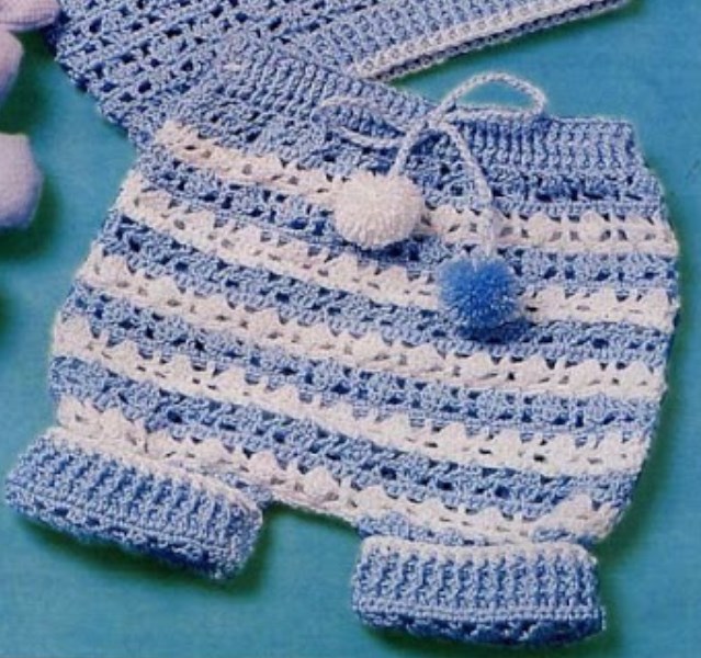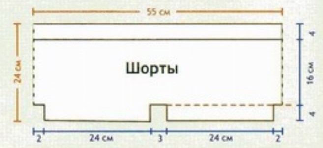 Выполняем боковые швы, после чего обвязываем нижний краешек обеих штанин шортиков, выполняя 1 р. с. без н. и отделывая по схеме 3. Продеваем резиночку в кулиску, хорошенько отпариваем и просушиваем готовое изделие.
