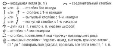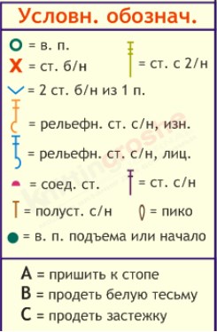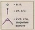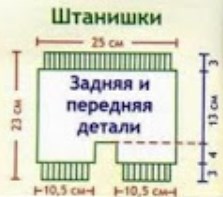 Для каждой штанины набираем по одной цепочке из 28 в. п. и вяжем узором согласно схемы, вывязывая с наружных сторонок по 3 с. с н. Довязав штанины до высоты в 4 см, объединяем их, набирая дополнительную цепь из 5 в. п. = 59 п. в целом. Продолжаем вязание в узор по схеме до высоты в 24 см, где приступаем к вязанию простых с. с н. Связав до уровня 26 см, завершаем работу.