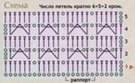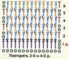 Набираем с помощью крючка цепочку, состоящую из 104 в. п., вяжем в узор согласно схемы на 34 рапп.