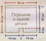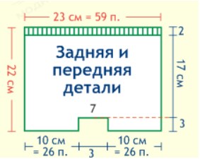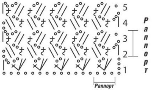 Связав 5 р., сля средних шовчиков оставляем без провязывания справа в каждом рядочке 8 х ½ рапп., слева в каждом рядочке 1 х 2,5 рапп., 5 х ½ рапп., далее в каждом 5 рядке по ½ рапп. Связав 29 р. с начала швов, провязываем рядок, чередуя с. с н. и в. п., далее выполняем еще рядок «рачьего шага» и заканчиваем вязание.