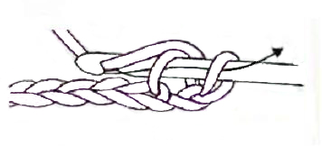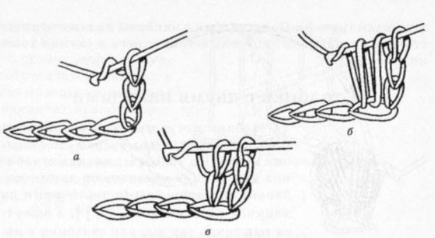 - 3 р.: 2 воздушн. п. п., с. с н., связав их за переднюю дольку до конца рядка.