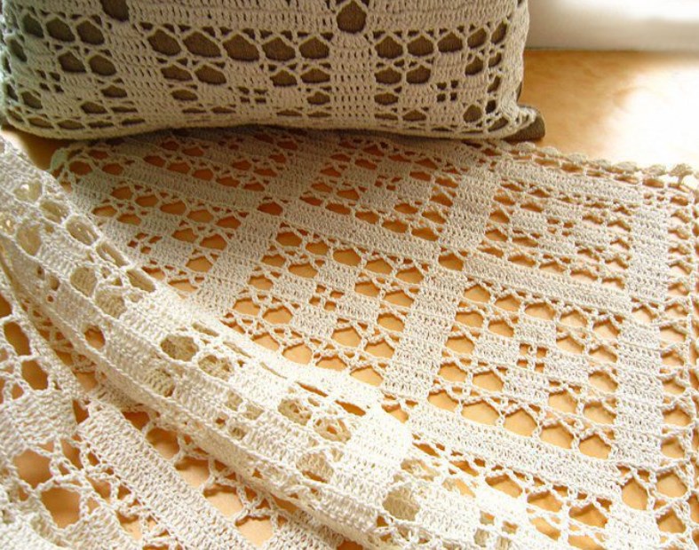- Филейное вязание: вяжется прямыми и обратными рядками, узор образуется путем чередования воздушных петелек и столбиков с накидом. С помощью филейного вязания создаются красивые ажурные салфетки, скатерти, покрывала и даже платья! Выглядит филейное вязание так: