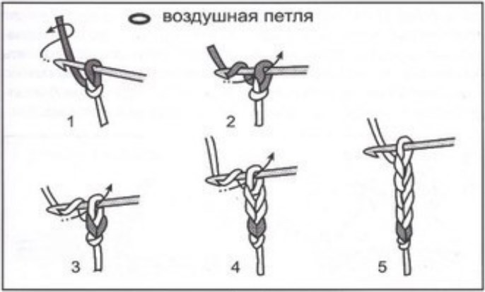 - Начальная петля – самая первая во всем вязании. Вяжется она совсем не так, как все остальные: размещаем кончик нитки на указательном пальчике, лале заводим под нее крючок в направлении слева направо, переворачиваем его, выполняем сверху накид основной ниткой и протягиваем ее сквозь образовавшуюся петельку.