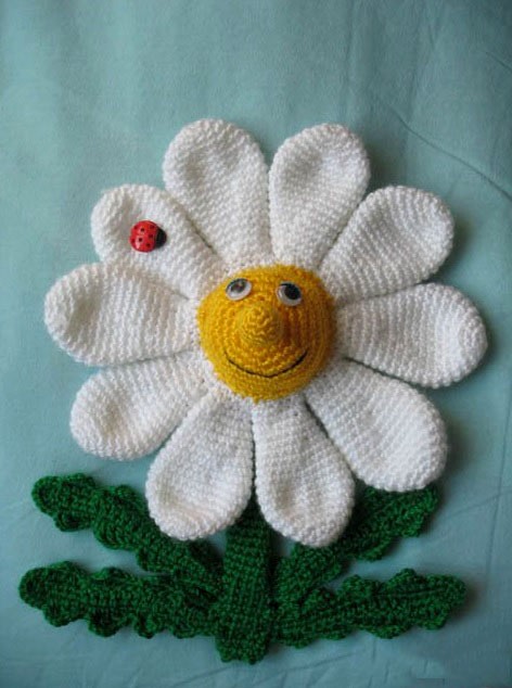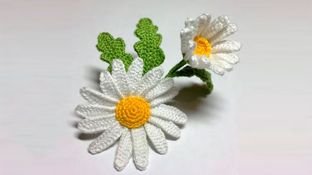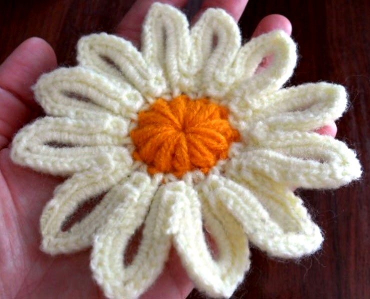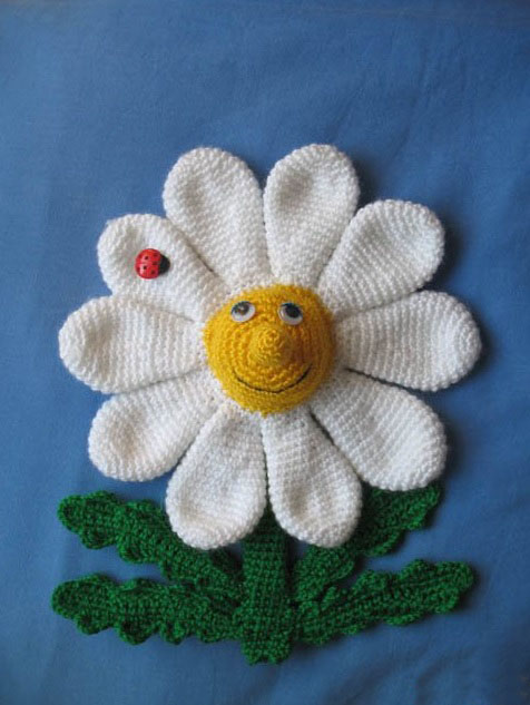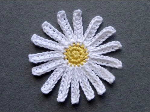 Вязаная ромашка крючком будет интересным украшение для различных вещей, она может использоваться в виде броши, браслета, как элемент колье. Цветком можно украсить прическу. Как связать ромашку можно узнать из нашей статьи, содержащей подробные описания и фото.