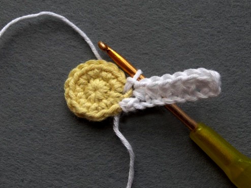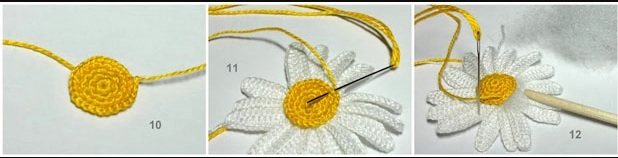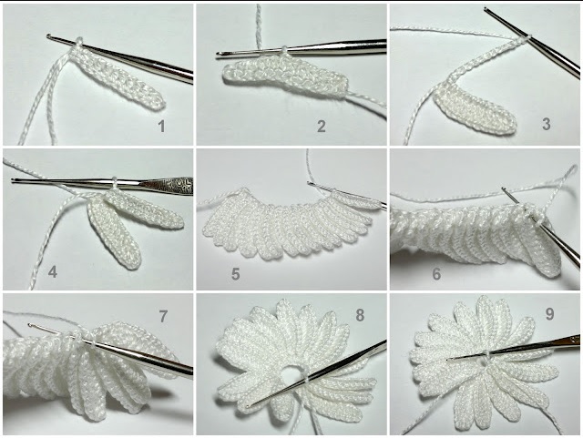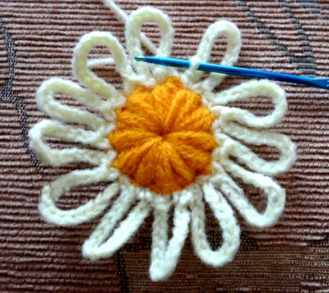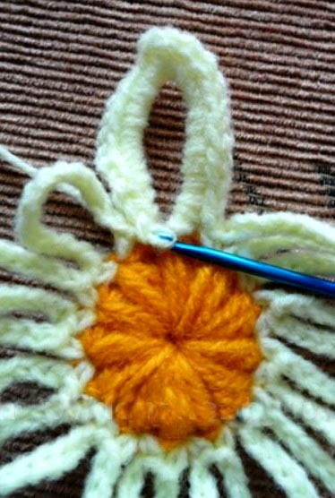 - 3р.: подсоединяем белую пряжу, *8 ВП, ст. б/н во 2-ую п. от крючка, 6 полуст. с нак., СС в след. п. предыд. р.* – от * и до * повторяем для 16-ти лепестков.
