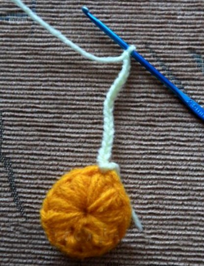 Через 1 ВП вяжем еще 11 пышных ст. Завершаем круг. р. СС на вершине пышного ст. Нитку обрезаем, конец выводим на изнанку и закрепляем.