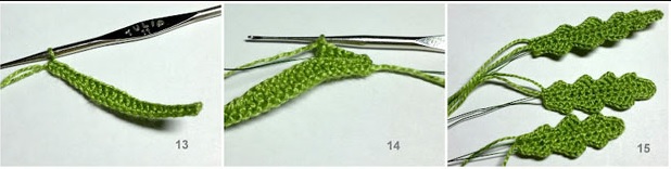 Используя этот мастер – класс связать еще 2 листика меньшего размера. Для них исходную цепочку набираем из меньшего числа ВП и уменьшаем высоту и кол-во зубчиков на листе.