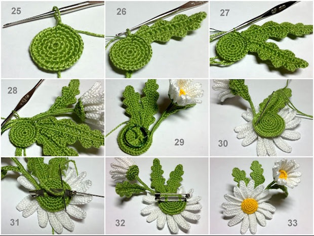 После 5-го р. подсоединяем стебель, провязываем 2-3 столбика без нак., подсоединяем листик, провязываем 2-3 столбика без/н., подсоединяем еще один листик, заканчиваем ряд.