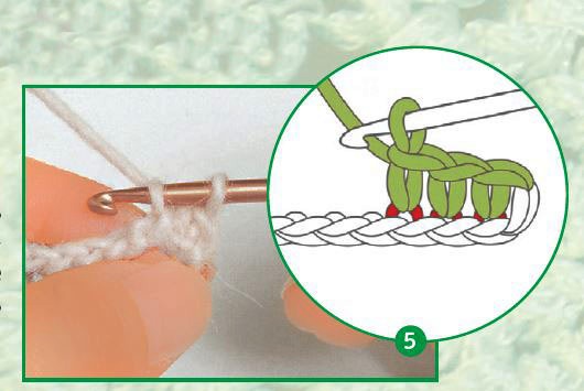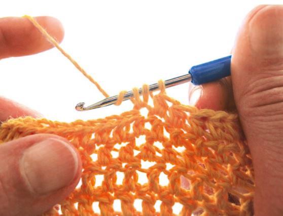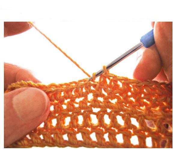 - довязываем ряд до конца, провязывая в каждую 4-ую птл ряда по три полустлб с накидом, а между ними – 1 ВП.