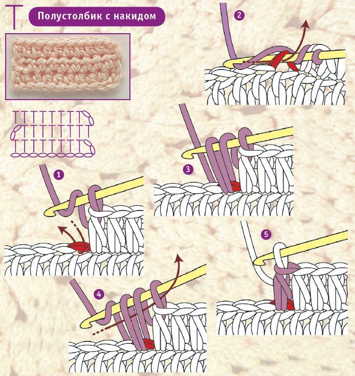 Как вязать крючком полустлб с накидом – см. фото и описание к ним.