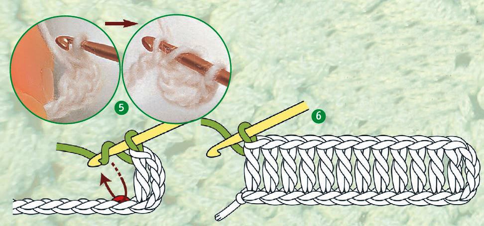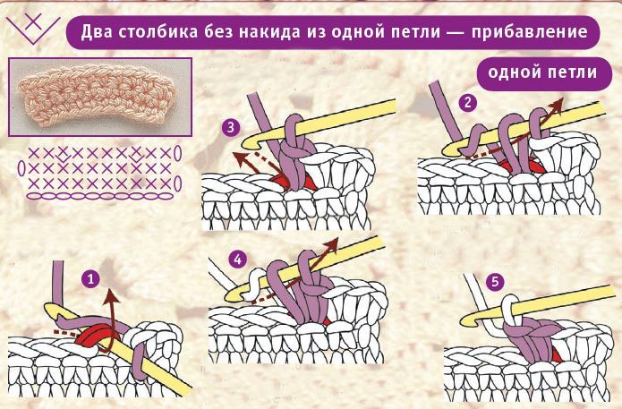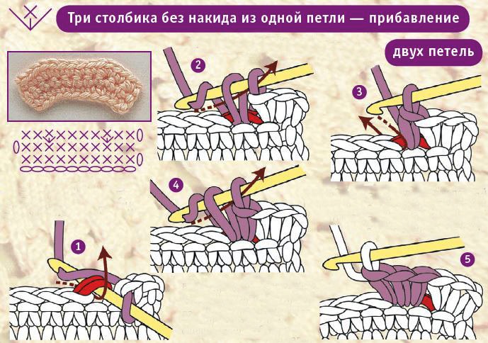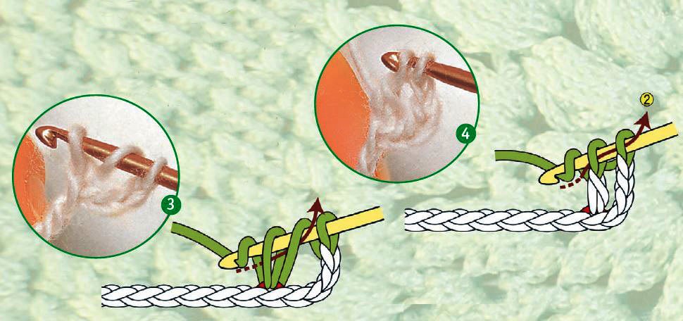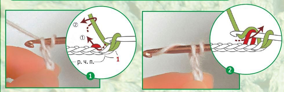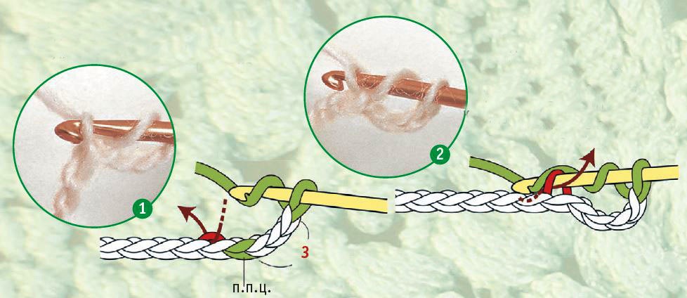 - делаем 2 накида, вводим крючок под две дуги пет. пред-щего р.;