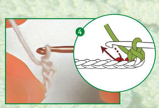 Делаем накид, вводим крючок под заднюю дугу 1-ой птл цепочки, захватываем нить и вытаскиваем птл.