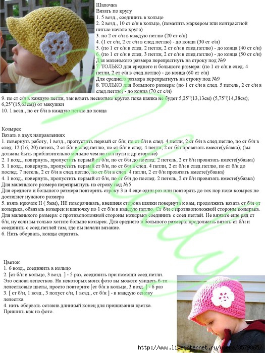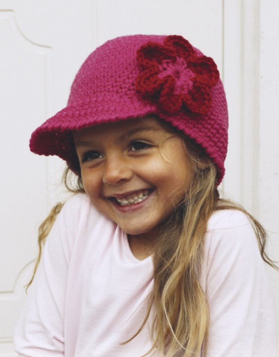 Из плотного картона вырезаем шаблон козырька, вставляем в вязание и обвязываем краешек крючком 1 р. с. без н. Выполняем цветочек из светло-желтой пряжи согласно схемы, пришиваем его к кепочке, как показано на фото.