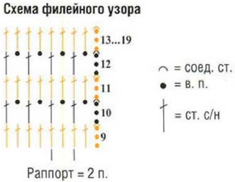 - 13 р.: (осн. ниточка) 1 в. п., 1 с. без н. в ту же п., *(1 в. с. с н. в сл. п., 1 с. без н. в сл. п.) х 4, (1 с. без н., 1 в. с. с н.) в сл. п., 1 с. с н. в сл. п.*, от 8 до * до последних 9 п., (1 в. с. с н. в сл. п., 1 с. без н. в сл. п.) х 4, (1 с. без н., 1 в. с. с н.) в сл. п. = 110 п.