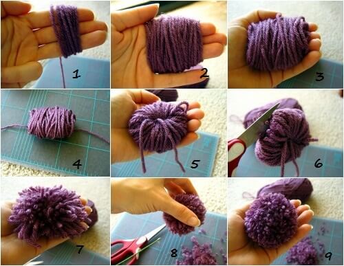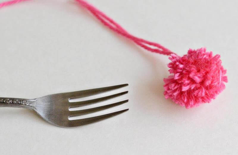 Берём вилку в левую руку и, придерживая небольшой хвостик нитки пальцем, наматываем правой рукой пряжу. Больше мотков – пушистее помпончик.