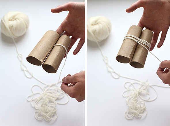 Берём два картонных рулона в левую руку. Протаскиваем нитку между ними и зажимаем её. Наматываем нить сразу на два рулона, отрезаем нитку от мотка и связываем намотку, как показано на фото.