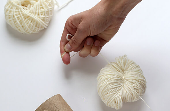 Отрезаем кусок нитки, продеваем между картонными трубками и плотно (это важно!) стягиваем намотку в узелок. Аккуратно снимаем и ещё раз стягиваем.