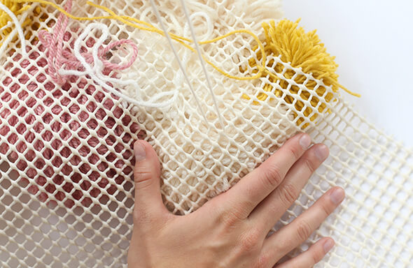 Обязательно оставляем концы ниток – ими мы будем привязывать помпоны к сетке (основа из страмина).