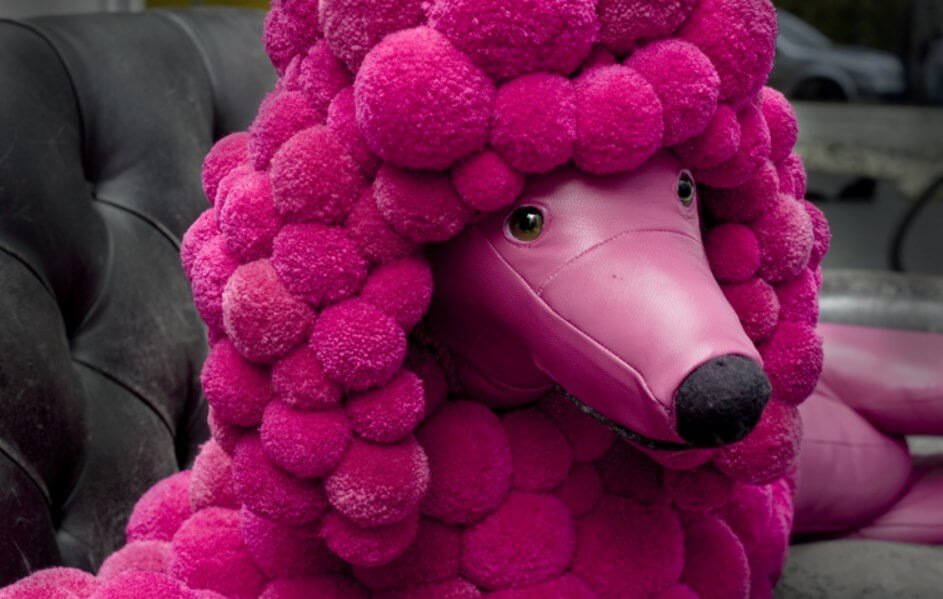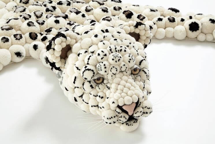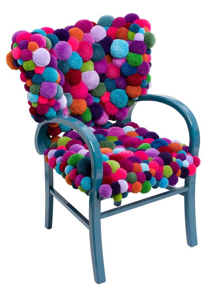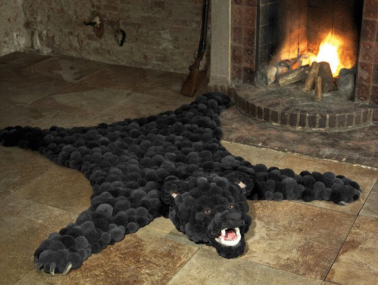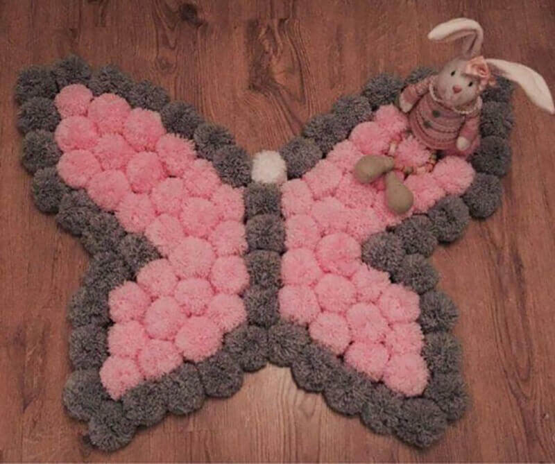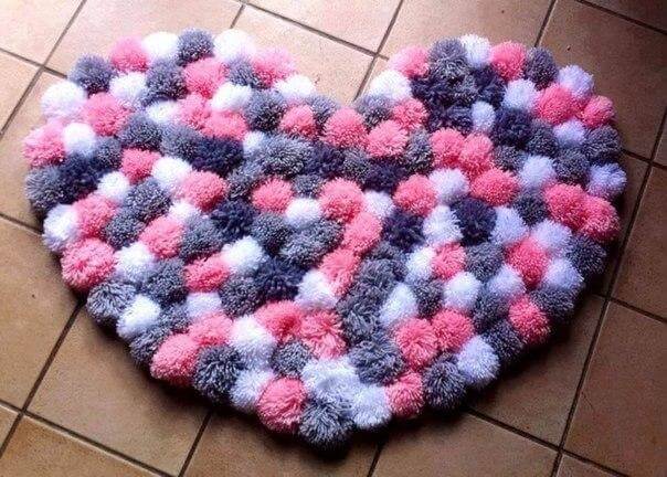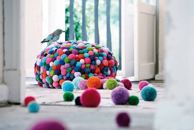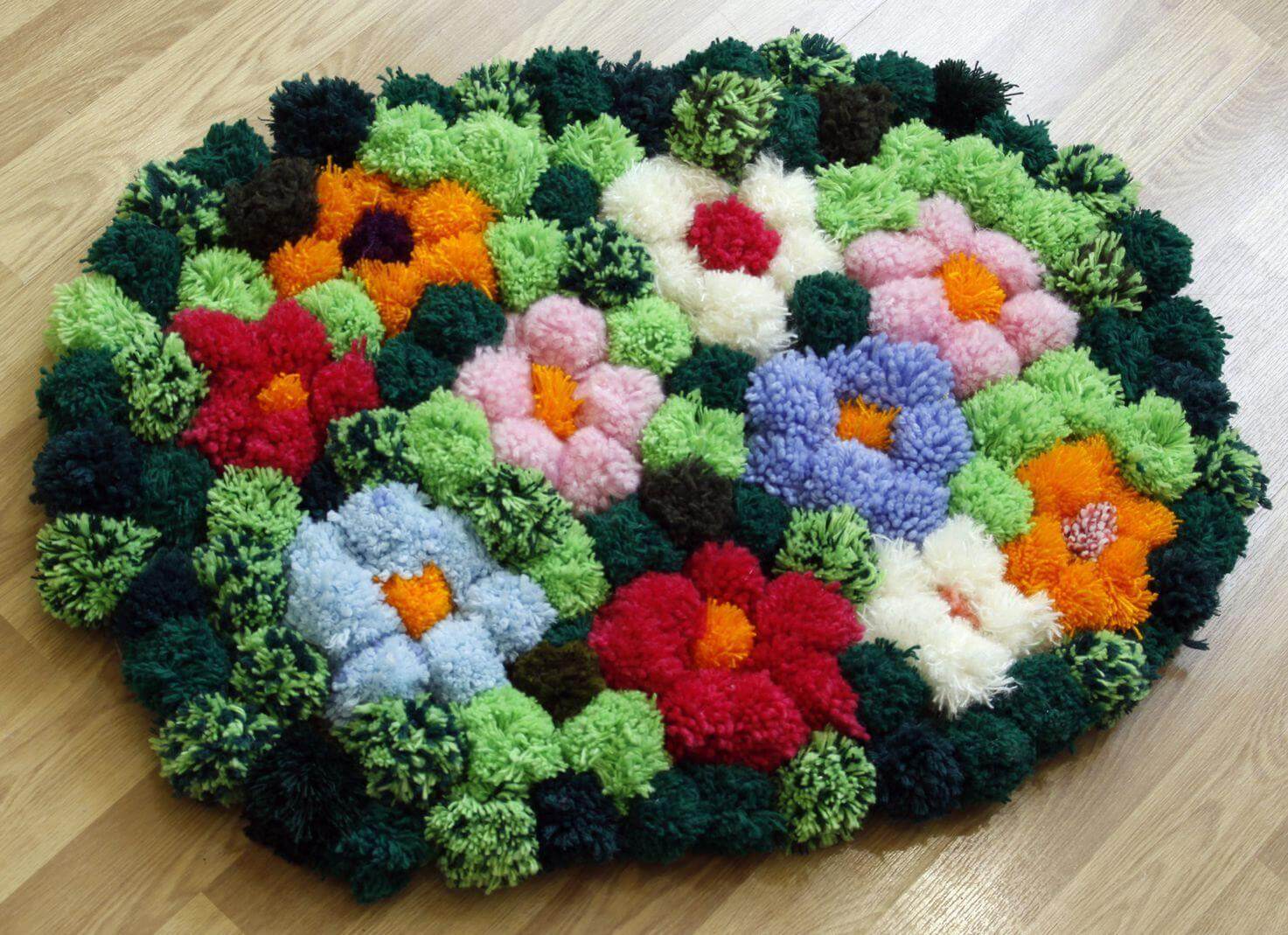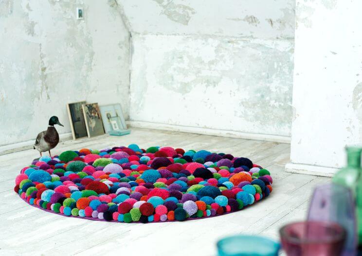 С помощью пушистых деталей можно создать креативные коврики из помпонов в гостиную:
