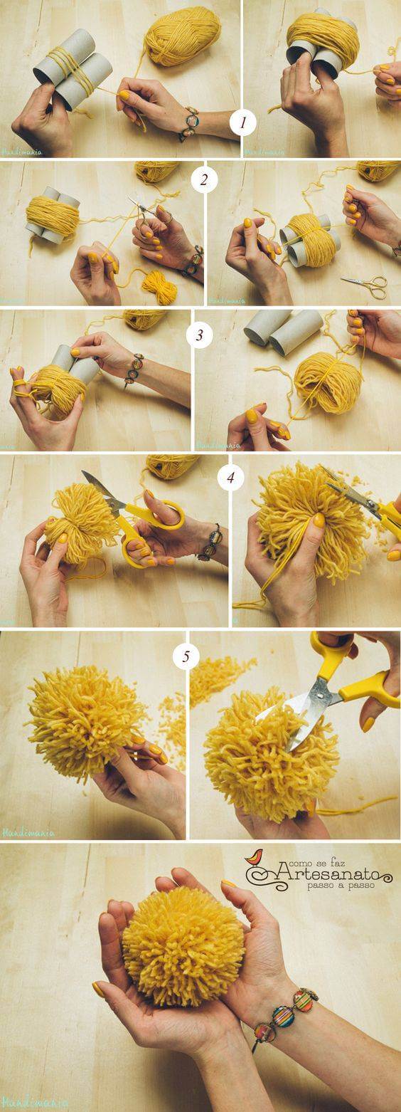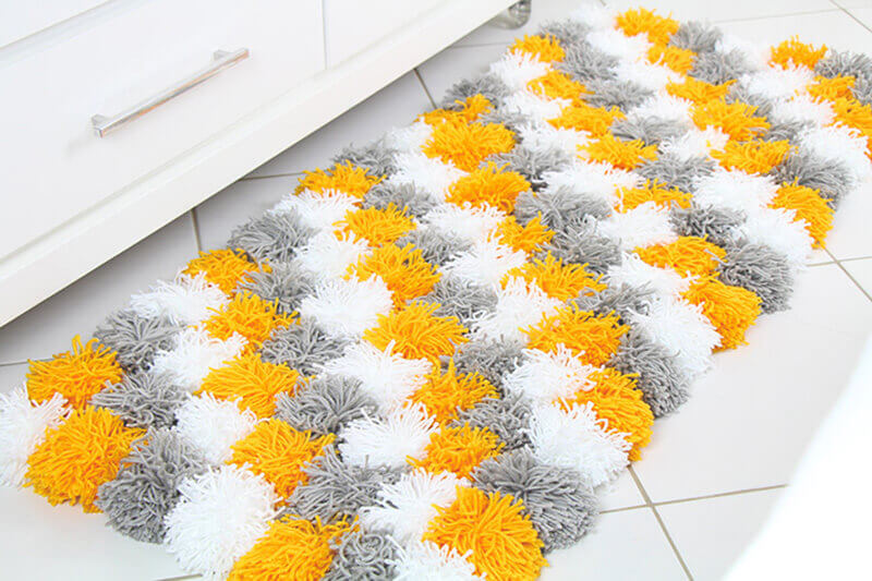 Как правило, помпоны для ковриков делают из остатков толстой пряжи для вязания. Такие «пушистики» замечательно сохраняют свою форму, не придавливаются и неплохо переносят стирку.