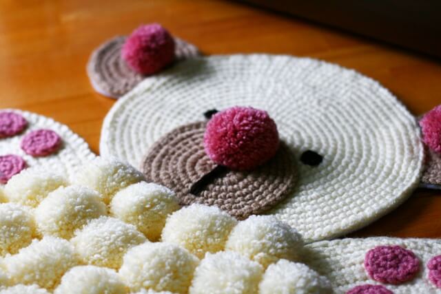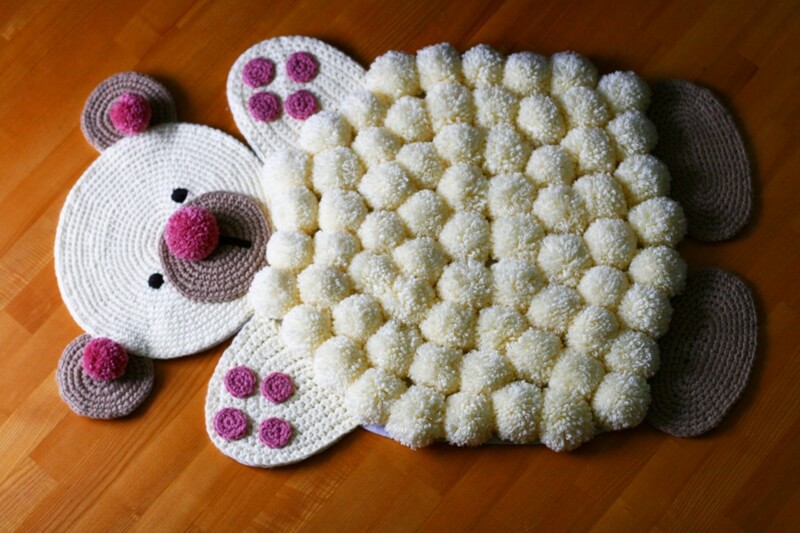 Ещё один вариант – коврик-медвежонок из помпонов: