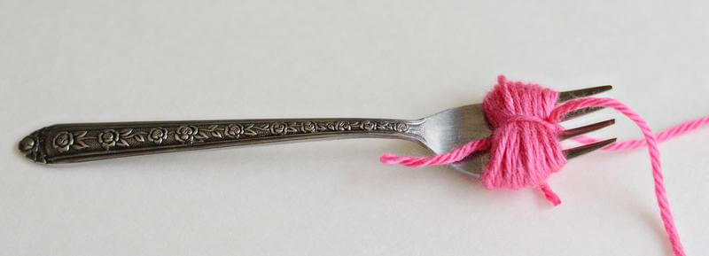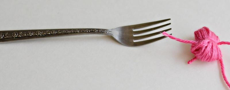 Итак, продеваем пряжу между зубьев вилки, как показано на фото: