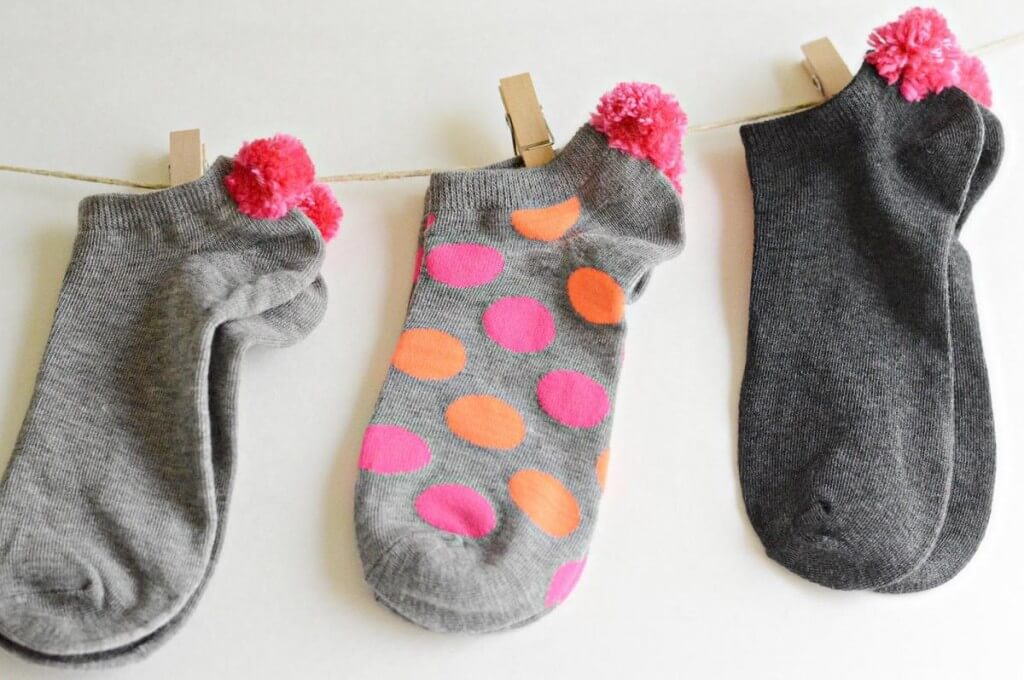 - готовые разноцветные помпоны из толстой пряжи желаемого диаметра (обязательно оставляйте длинные нитки после завязывания узелка!);