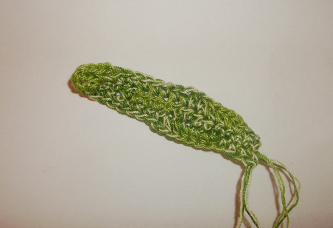 Следующий этап – вывязывание листиков. Из зеленой пряжи (лучше – меланжевой) крючком делаем 18 ВП. В 3-тью ВП вяжем СБН. В следующую ВП тоже – СБН. Далее – 9 полустолбиков с накид., 5 СБН.