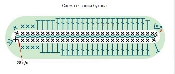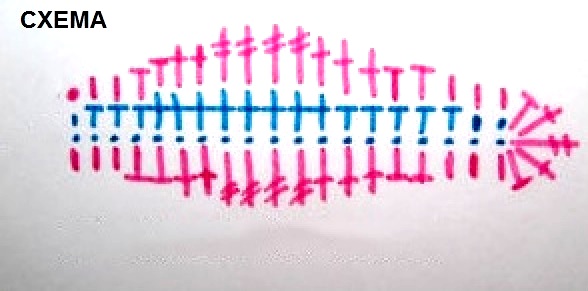 - 1р.: с 3-ей п. от крючка: 1 СтБН, 4 полуст. с/н, 7 ст. с/н, 3 полуст. с/н, 1 СтБН;