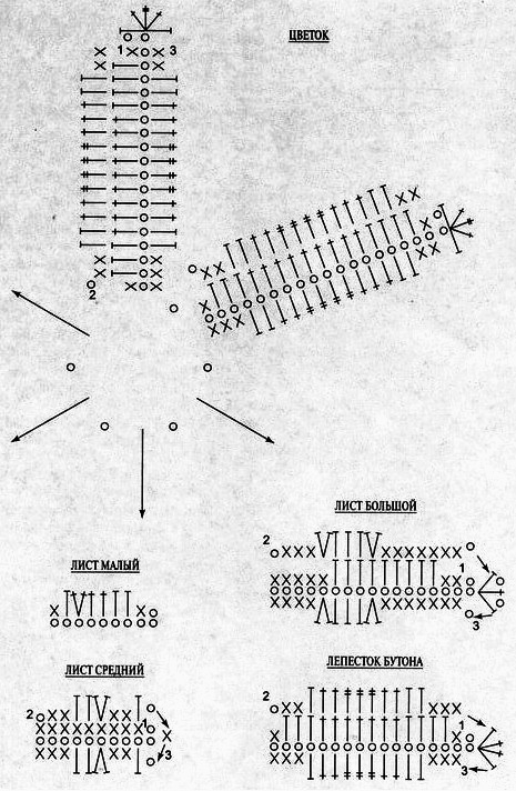 Приведенная схема используется для вязания еще 4 зеленых листиков общей композиции, т. е. всего их нужно 5 штук.