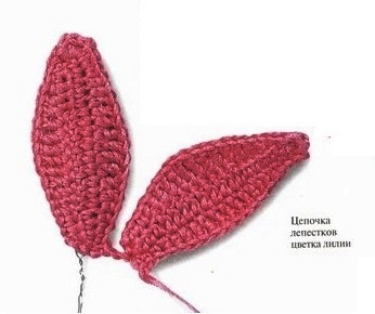 Приступая к вязанию 2-го р. лепестка лилии, мы должны первой вязать 1 ВП. Поворачиваем работу и далее вязание ведем в противоположную сторону.