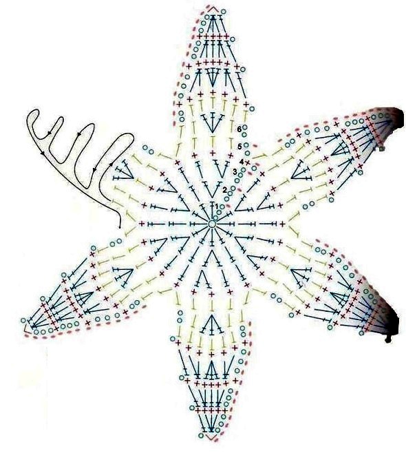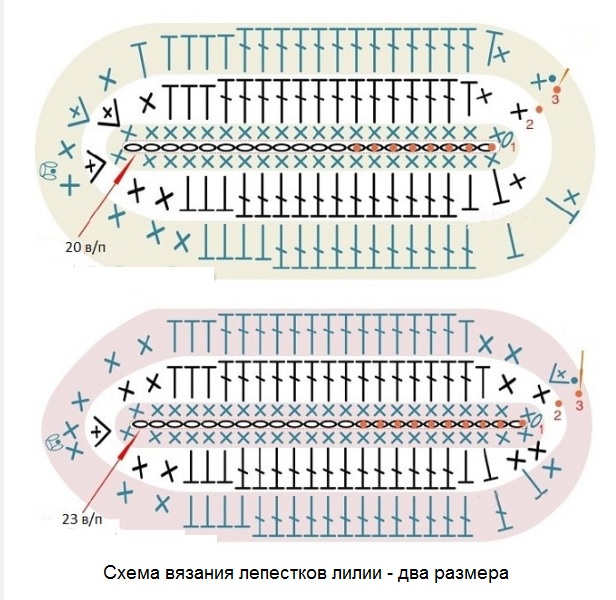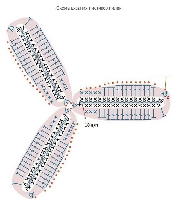 - схема содержит изображения фрагмента лилии. Для каждого лепестка вязать по 1 раппорту;