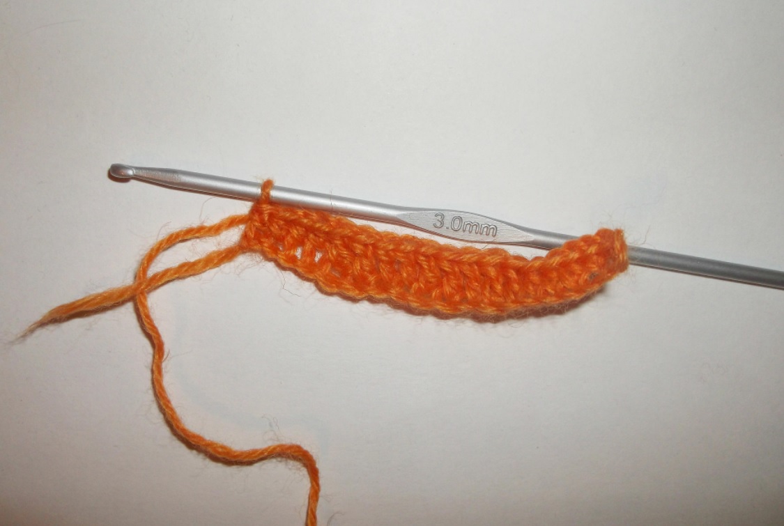 Начинаем вязать цветок с лепестков. Пряжей оранжевого цвета набираем 20 ВП. На них нужно выполнить три ряда вязки крючком.