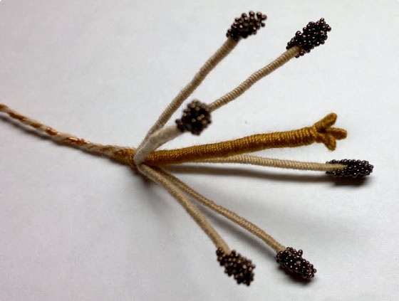Тычинки делаем из проволоки, которую обматываем пряжей и декорируем микробисером.