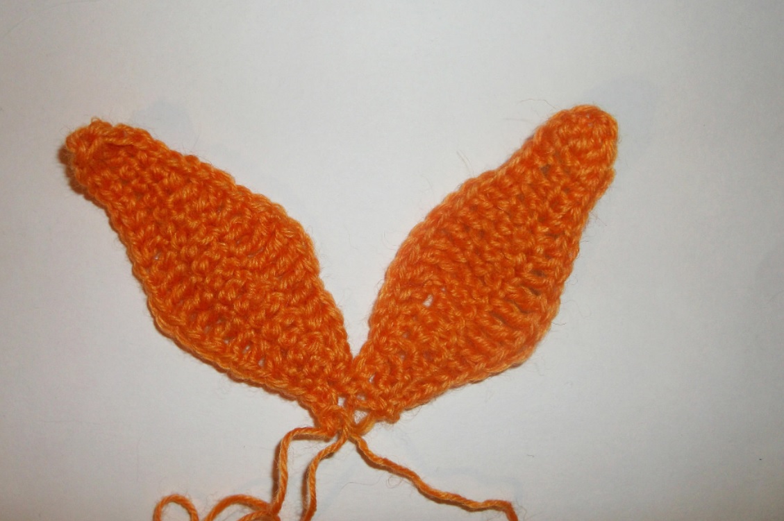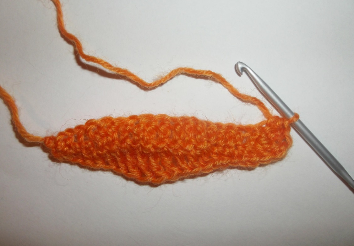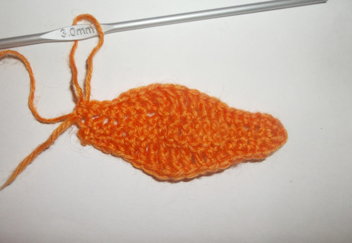 Зеленой пряжей вывязываем цепочку из 20 возд. п. Вяжем, начиная со второй петельки от крючка: 2 СБН, 3 полуССН, 9 стлб с накид., 3 полуССН, 2 СтБН. В самую первую петельку вывязываем для поворота 3 СБН. По второй стороне свяжем зеркальный рядок.