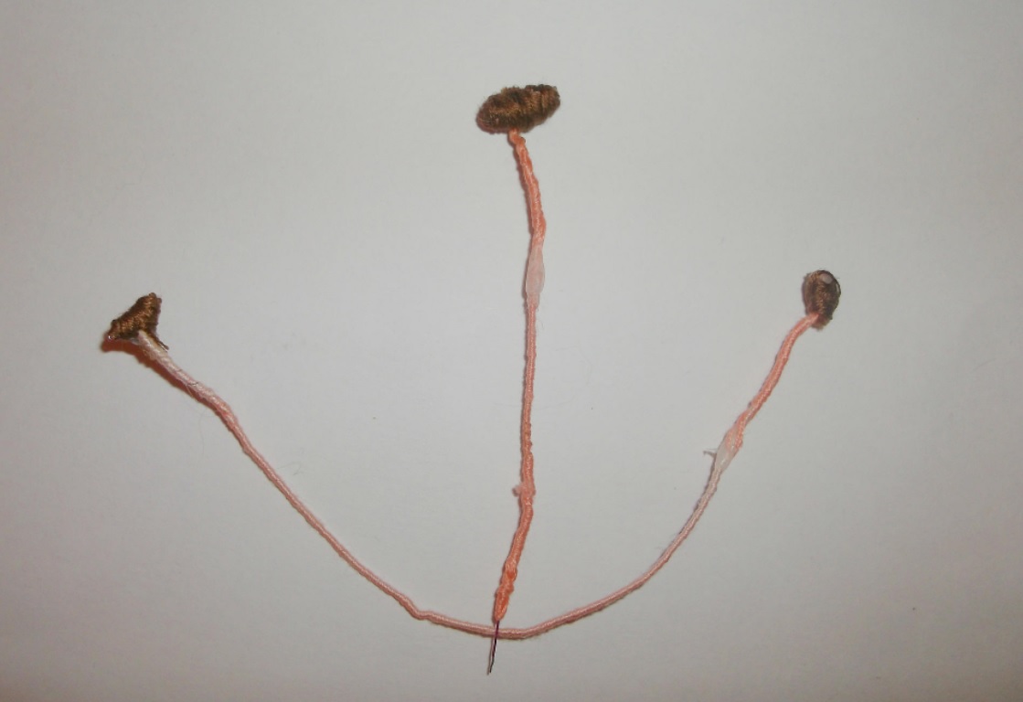 Следующий этап – изготовление тычинок лилии. Из проволоки отрезаем кусочки нужной длины. Учитывайте, что она должна быть с запасом: на одном конце тычинки нужно из проволоки согнуть небольшое уплотнение, по форме буквы «Т». Обматываем всю тычинку бежевой пряжей, а ее верхушку – коричневой. Для фиксации пряжи слегка проклеиваем ее.