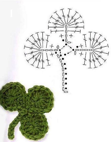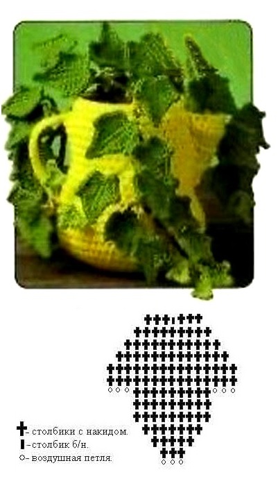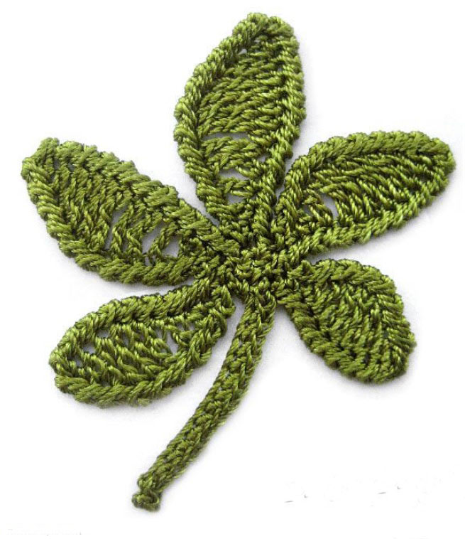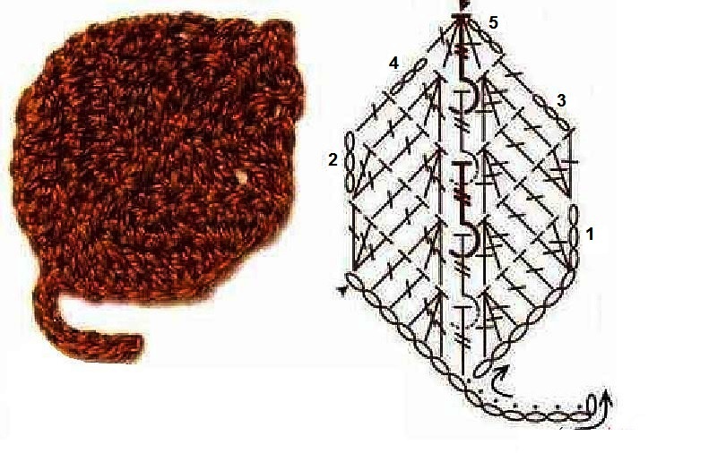 Начинаем с цепочки из 4 ВП. Далее связать 1 ВП подъема, 1 столбик без накида, 1 столбик с накидом, в последнюю п. цепочки вязать 10 столбиков с 2-мя накидами. Получился лепесток. Аналогично связать еще два лепесточка. Потом, не обрывая нити, вязать цепочку из 8 ВП. Далее схема такая: 1 воздушн. п. подъема, 7 стлб б/н, в последн. п. цепочки прикрепляем соедин. стлб все три детали листочка.