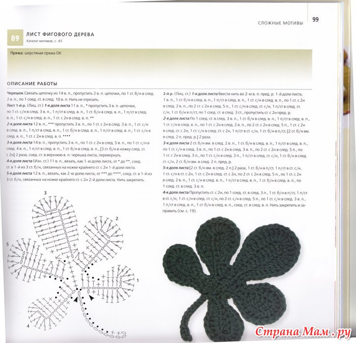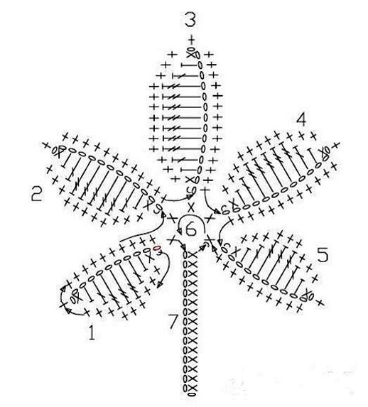 Не обрывая нити, вяжем 2-ой лист и все последующие. Алгоритм такой же, кол-во петель исходной цепочки смотрим по изображения схемы.