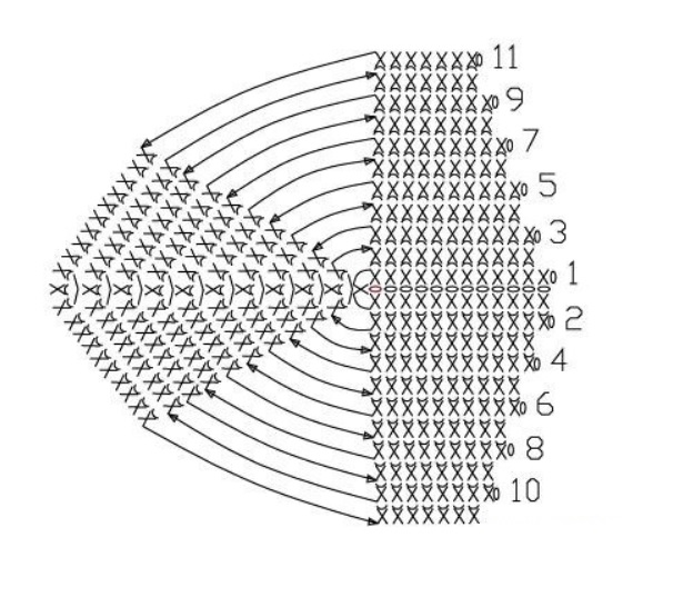 - 8р.: 5 фрагментов [9 СтСН плюс 3 возд. п. плюс 9 СтСН.], заменив в начале первый СтСН на 3 ВП подъема;